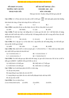 Câu 2 (NB): Loại phân t nà ử o sau đây đư c ợ cấu trúc b i ở các đ n phâ ơ n là axit amin? A. ARN B. Prôtêin. C. Lipit. D. ADN. Câu 3 (NB): Ở m t ộ loài th c ự v t ậ lư ng ỡ b i ộ có 6 nhóm gen liên k t ế . Xét 3 thể đ t ộ bi n ế số lư ng ợ nhiễm sắc th l ể à th m ể t ộ , th ba ể và th t ể am b i ộ . Số lư ng nhi ợ m ễ s c ắ thể có trong m i ỗ t bà ế o c a ủ m i ỗ thể đ t ộ bi n t ế heo th t ứ ự là A. 5,7,9. B. 22,26,36. C. 10,14,18. D. 11,13,18. Câu 4 (NB): Xét 2 c p ặ gen A,a và B,b n m ằ trên 2 c p ặ nhi m ễ s c ắ th ể tư ng ơ đ ng, ồ cho bi t ế ki u ể gen nào sau đây là ki u ge ể n d h ị p? ợ A. AaBB. B. AAbb. C. aabb. D. AABB. Câu 5 (NB): M t ộ chu i ỗ ADN có trình tự m c ạ h g c ố :3’-ATGGXATXA- 5’. N u ế chu i ỗ này đư c ợ phiên mã, chu i ỗ ARN t o t ạ hành s nh ẽ t ư h nà ế o? A. 5'-UAXXGUAGU -3' B. 5'- UGAUGXXAU -3' C. 5'- AUGGXAUXA -3’ D. 5'- TAXXGTAGT-3' Câu 6 (NB): Cho bi t ế m t ộ gen quy đ nh ị m t ộ tính tr ng, ạ các gen tr i