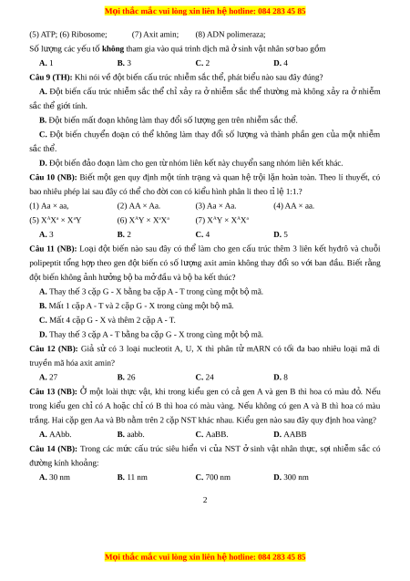 Câu 14 (NB): Trong các m c ứ c u ấ trúc siêu hi n ể vi c a ủ NST ở sinh v t ậ nhân th c ự , s i ợ nhi m ễ s c ắ có đư ng ờ kính khoảng: A. 30 nm B. 11 nm C. 700 nm D. 300 nm 2 M i ọ thắc m c