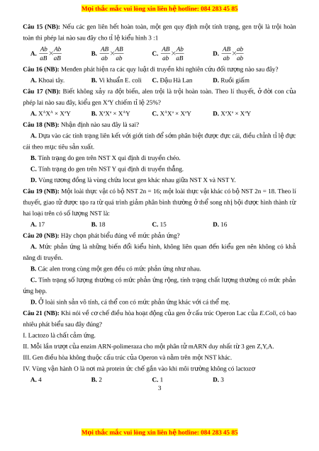 C. Tính trạng do gen trên NST Y qui đ nh di ị truy n t ề h ng. ẳ D. Vùng tư ng ơ đ ng ồ là vùng ch a ứ locut gen khác nhau gi a ữ NST X và NST Y. Câu 19 (NB): M t ộ loài th c ự v t ậ có b ộ NST 2n = 16; m t ộ loài th c ự v t ậ khác có b ộ NST 2n = 18. Theo lí thuyết, giao tử đư c ợ t o ạ ra t ừ quá trình gi m ả phân bình thư ng ờ ở th ể song nh ịb i ộ đư c ợ hình thành từ hai loại trên có s l ố ư ng ợ NST là: A. 17 B. 18 C. 15 D. 16 Câu 20 (NB): Hãy ch n ọ phát bi u đúng v ể m ề c ứ phản ng? ứ A. M c ứ phản ng ứ là nh ng ữ bi n ế đ i ổ ki u