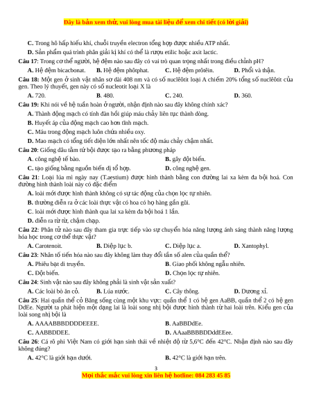 ể gen nào sau đây sinh con có th xu ể ất hi n 4 nhóm ệ máu A, B, O và AB? A. A B A O I I I I B. A B O O I I I I C. A O B O I I I I D. A B B O I I I I Câu 13: Trong l c ị h s phá ử t tri n c ể a ủ sinh gi i ớ , th c ự v t ậ có h t ạ xu t ấ hi n ệ đ ở i ạ A. Tân sinh. B. Cổ sinh. C. Trung sinh. D. Thái c . ổ Câu 14: D ng đ ạ t ộ bi n nà ế o làm thay đ i ổ hàm lư ng ợ ADN trong m t ộ t bà ế o?