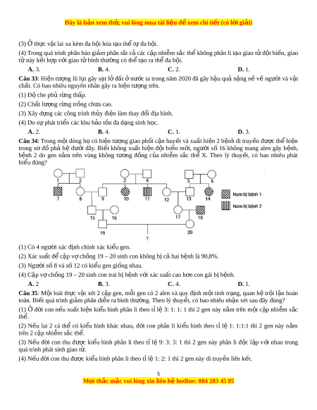 Câu 32: Có bao nhiêu nhận đ nh đúng khi ị nói v đ ề t ộ bi n nhi ế m ễ s c ắ th ? ể (1) N u ế t t ấ cả các nhi m ễ s c ắ th ể không phân li ở l n ầ nguyên nhân đ u ầ tiên c a ủ h p ợ t ử thì có th ể t o ạ th ể tứ b i ộ . (2) Ở th c ự v t ậ , sự không phân li m t ộ ho c ặ m t ộ số c p ặ nhi m ễ s c