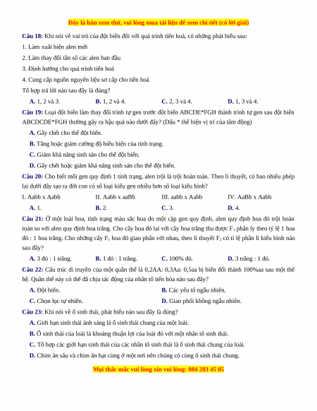 Câu 18: Khi nói về vai trò của đột biến đối với quá trình tiến hoá, có những phát biểu sau: