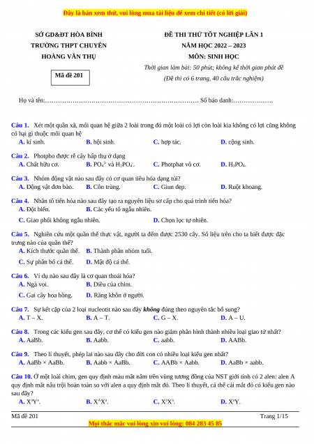 NĂM HỌC 2022 – 2023 HOÀNG VĂN THỤ MÔN: SINH HỌC