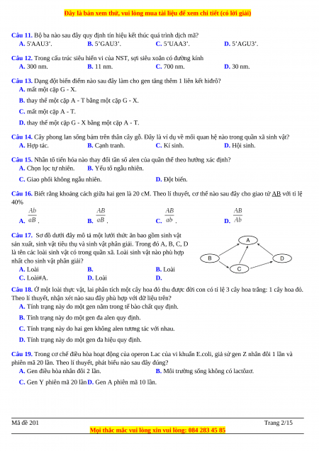 C. Gen Y phiên mã 20 lần D. Gen A phiên mã 10 lần. Mã đề 201 Trang 2/15