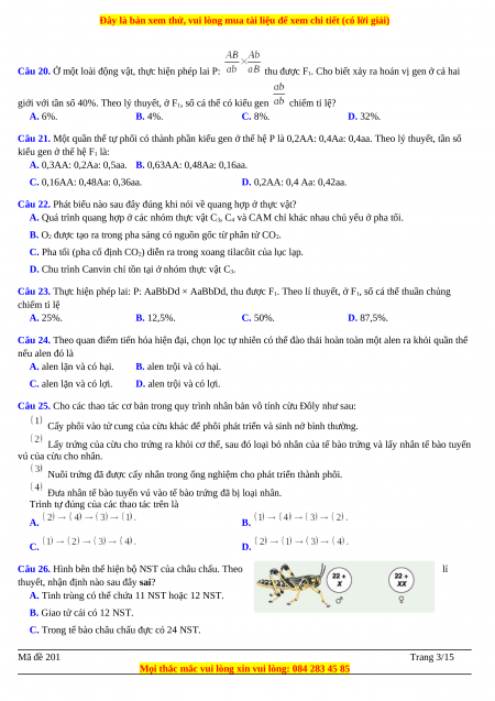 Câu 16. Biết rằng khoảng cách giữa hai gen là 20 cM. Theo lí thuyết, cơ thể nào sau đây cho giao tử AB với tỉ lệ