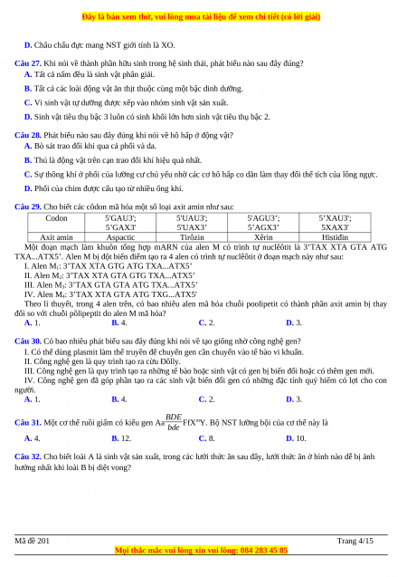 Câu 29. Cho biết các côdon mã hóa một số loại axit amin như sau: