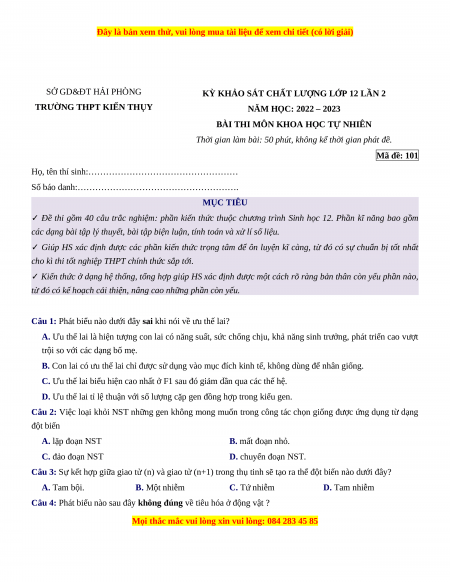 Đề thi thử Sinh học trường Kiến Thụy - Hải Phòng lần 2 năm 2023