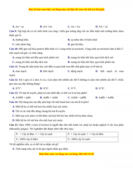 Câu 8: Trong trường hợp giảm phân bình thường, gen trội hoàn toàn, tỷ lệ phân li kiểu hình 1:1 ở đời con là