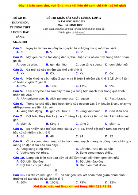 ĐỀ THI KHẢO SÁT CHẤT LƯỢNG LỚP 12 THANH HÓA NĂM HỌC 2022-2023 Môn thi: SINH HỌC