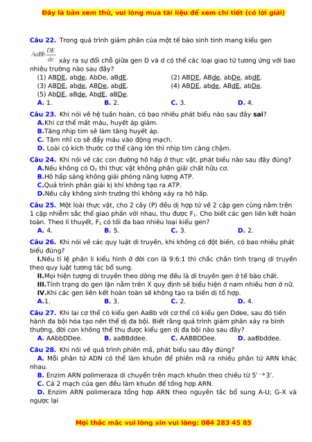 Câu 27. Khi lai cơ thể có kiểu gen AaBb với cơ thể có kiểu gen Ddee, sau đó tiến