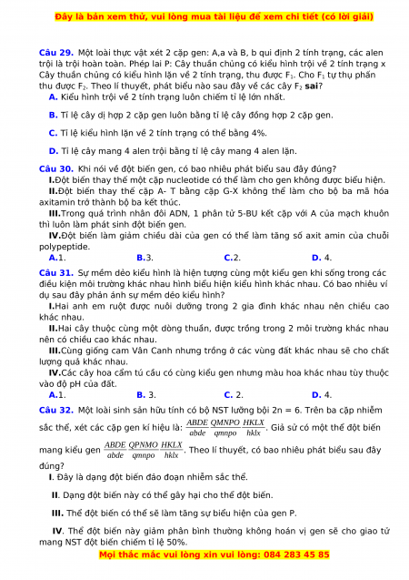 Câu 29. Một loài thực vật xét 2 cặp gen: A,a và B, b qui định 2 tính trạng, các alen