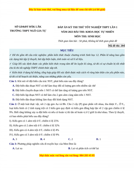 Đề thi thử Sinh học trường Ngô Gia Tự - Đăk Lăk năm 2023
