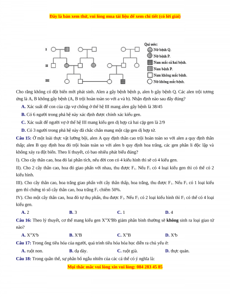 Câu 14: Phả hệ dưới đây mô phỏng sự di truyền của bệnh “P” và bệnh “Q” ở người. Hai bệnh này do hai