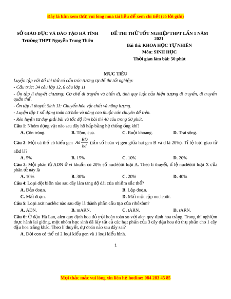 Đây là bản xem th , vu ử i lòng mua tài li u ệ đ xe ể m chi ti t ế (có l i ờ gi i ả ) SỞ GIÁO D C Ụ VÀ ĐÀO T O Ạ HÀ TĨNH Đ Ề THI TH Ử TỐT NGHI P Ệ THPT L N Ầ 1 NĂM Trư n ờ g THPT Nguy n ễ Trung Thiên 2021 Bài thi: KHOA H C Ọ T N Ự HIÊN Môn: SINH H C Ọ Th i