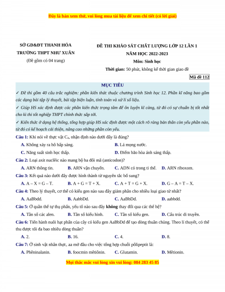 TRƯỜNG THPT NHƯ XUÂN NĂM HỌC 2022-2023 (Đề gồm có 04 trang) Môn: Sinh học