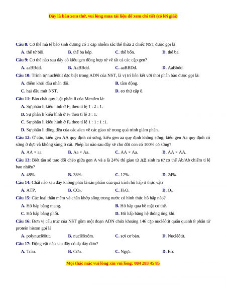 Câu 16: Đơn vị cấu trúc của NST gồm một đoạn ADN chứa khoảng 146 cặp nuclêôtit quấn quanh 8 phân tử