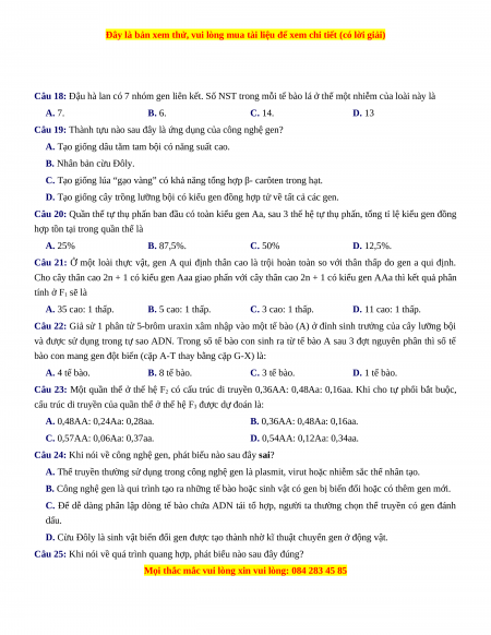 Câu 23: Một quần thể ở thế hệ F2 có cấu trúc di truyền 0,36AA: 0,48Aa: 0,16aa. Khi cho tự phối bắt buộc,