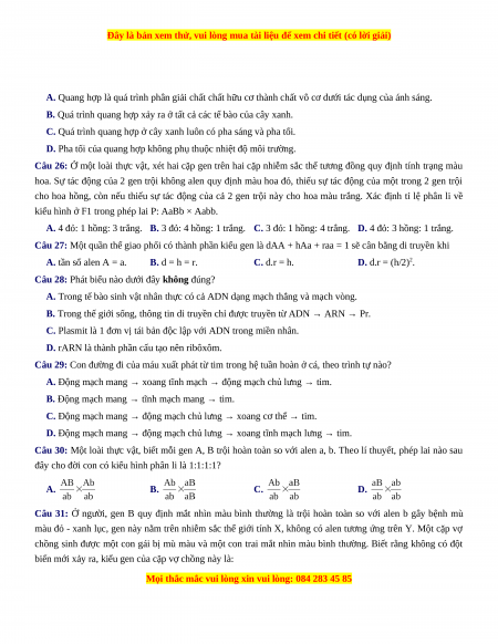 Câu 30: Một loài thực vật, biết mỗi gen A, B trội hoàn toàn so với alen a, b. Theo lí thuyết, phép lai nào sau