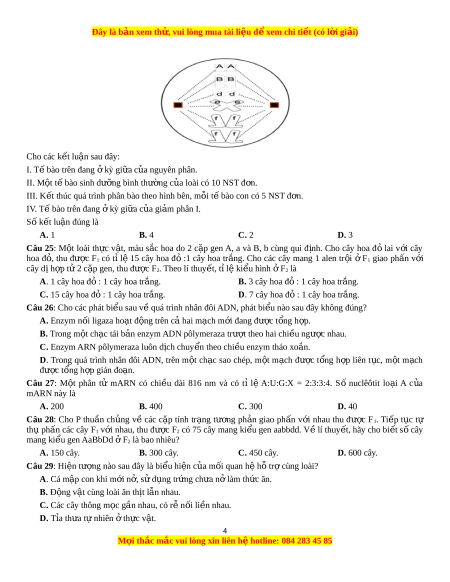 Đây là bản xem th , vu ử i lòng mua tài li u ệ đ xe ể m chi ti t ế (có l i ờ gi i ả ) Cho các k t ế luận sau đây: I. T bà ế o trên đang ở kỳ gi a ữ c a ủ nguyên phân. II. M t ộ t bà ế o sinh dư ng bì ỡ nh thư ng ờ c a ủ loài có 10 NST đ n. ơ