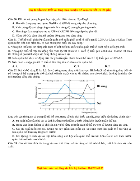 Câu 20: Nhân tố tiến hóa nào sau đây có thể làm phong phú hoặc có thể làm nghèo v n ge ố n c a ủ quần th ? ể A. Đ t ộ biến. B. Các y u t ế ng ố ẫu nhiên. C. Giao ph i ố không ngẫu nhiên. D. Di - nhập gen. Câu 21: Khi nói v đ ề ộ đa dạng c a ủ quần xã sinh vật, k t ế lu n nà ậ o sau đây không đúng? A. Đ đa ộ dạng c a ủ quần xã ph t ụ hu c ộ vào điều ki n s ệ ng c ố a ủ môi trư ng. ờ