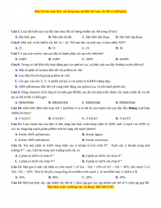 Câu 10: (Đột biến điểm làm thay thế 1 nuclêôtit ở vị trí bất kì của triplet nào sau đây đều không xuất hiện côđôn kết thúc? A. 3’AGG5’. B. 3’AXX5’. C. 3’AXA5’. D. 3’AAT5’