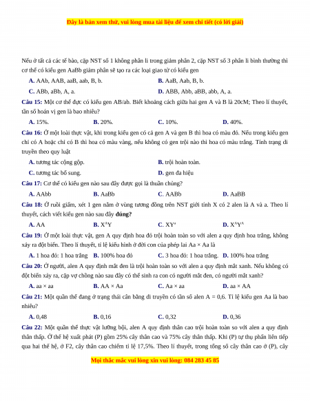 Câu 14: Một loài thực vật, cặp nhiễm sắc thể số 1 chứa cặp gen Aa; cặp nhiễm sắc thể số 3 chứa cặp gen Bb.