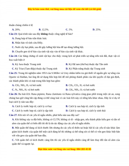 Câu 25: Trong thí nghiệm năm 1953 của S.Miller và Urey nhằm kiểm tra giả thiết về nguồn gốc sự sống của