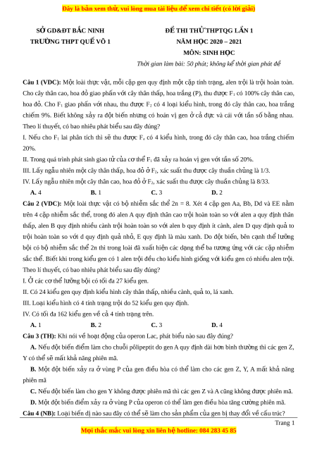 Câu 4 (NB): Loại bi n d ế nà ị o sau đây có th s ể l ẽ àm cho sản phẩm c a ủ gen b t ị hay đ i ổ v c ề u t ấ rúc? Trang 1 M i ọ thắc m c
