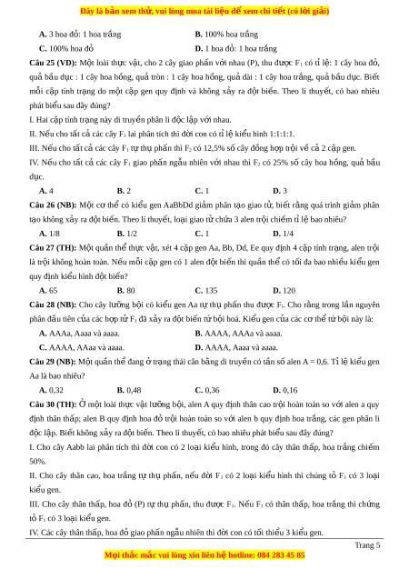Đây là bản xem th , vu ử i lòng mua tài li u ệ đ xe ể m chi ti t ế (có l i ờ gi i ả ) Câu 18 (VD): M t ộ loài th c ự v t ậ , tính tr ng ạ màu hoa do 2 c p