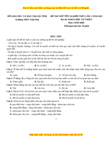 Đây là bản xem th , vu ử i lòng mua tài li u ệ đ xe ể m chi ti t ế (có l i ờ gi i ả ) SỞ GIÁO D C Ụ VÀ ĐÀO T O Ạ HÀ TĨNH Đ Ề THI TH Ử TỐT NGHI P Ệ THPT L N Ầ 1 NĂM 2021 Trư n ờ g THPT Tr n ầ Phú Bài thi: KHOA H C Ọ T N Ự HIÊN Môn: SINH H C Ọ Th i
