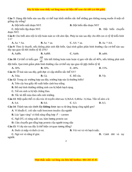 ế nào sau đây có thể lo i ạ kh i ỏ nhi m ễ s c ắ thể nh ng ữ gen không mong mu n ố ở m t ộ số gi ng ố cây tr ng? ồ A. Đ t ộ biến mất đoạn NST. B. Đ t ộ bi n đ ế ảo đoạn NST C. Đ t ộ biến lặp đoạn NST. D. Đ t ộ bi n ế chuy n ể đoạn NST. Câu 8: Cho bi t ế alen tr i ộ là tr i ộ hoàn toàn so v i ớ alen l n.