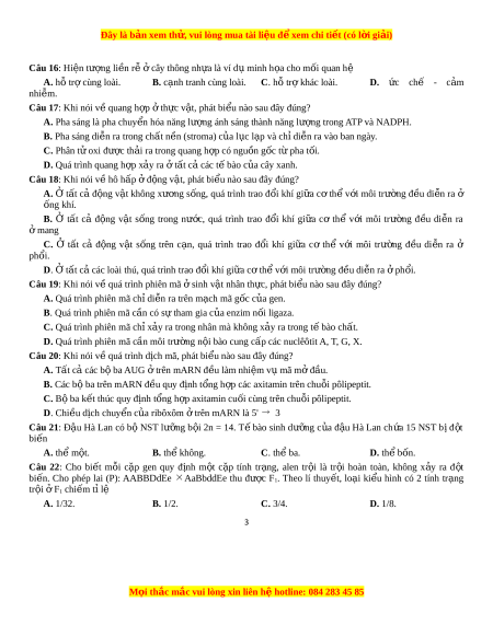 Đây là bản xem th , vu ử i lòng mua tài li u ệ đ xe ể m chi ti t ế (có l i ờ gi i ả ) Câu 16: Hi n t ệ ư ng ợ li n r ề ễ ở cây thông nh a ự là ví d m ụ inh h a ọ cho m i ố quan hệ A. h t ỗ rợ cùng loài.