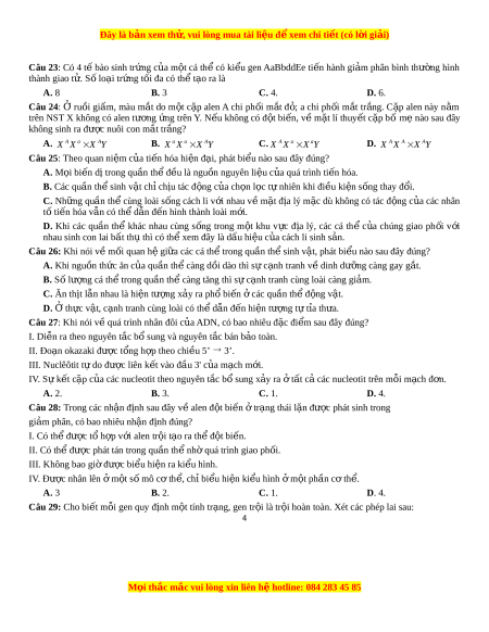 Đây là bản xem th , vu ử i lòng mua tài li u ệ đ xe ể m chi ti t ế (có l i ờ gi i ả ) Câu 23: Có 4 t ế bào sinh tr ng ứ c a ủ m t ộ cá th c ể ó ki u ể gen AaBbddEe ti n ế hành gi m ả phân bình thư ng ờ hình thành giao t . ử S l ố oại tr ng ứ t i ố đa có th t ể o ra ạ là A. 8 B. 3 C. 4. D. 6. Câu 24: Ở ru i ồ giấm, màu m t ắ do m t ộ c p ặ alen A chi ph i ố m t ắ đ ; ỏ a chi ph i ố m t ắ tr ng. ắ C p ặ alen này n m ằ