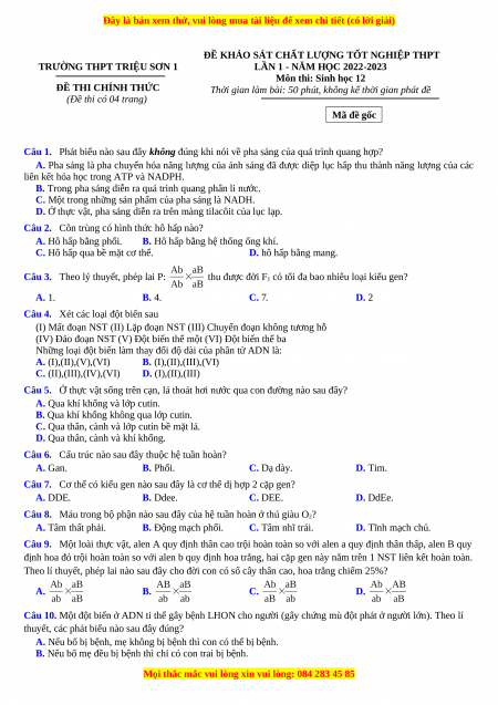 LẦN 1 - NĂM HỌC 2022-2023 Môn thi: Sinh học 12