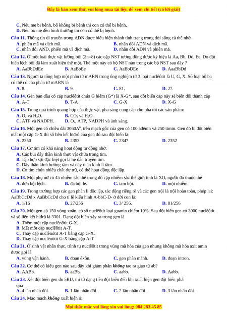 Câu 14. Gen ban đầu có cặp nuclêôtit chứa G hiếm (G*) là X-G*, sau đột biến cặp này sẽ biến đổi thành cặp A. A-T B. T-A C. G-X D. X-G