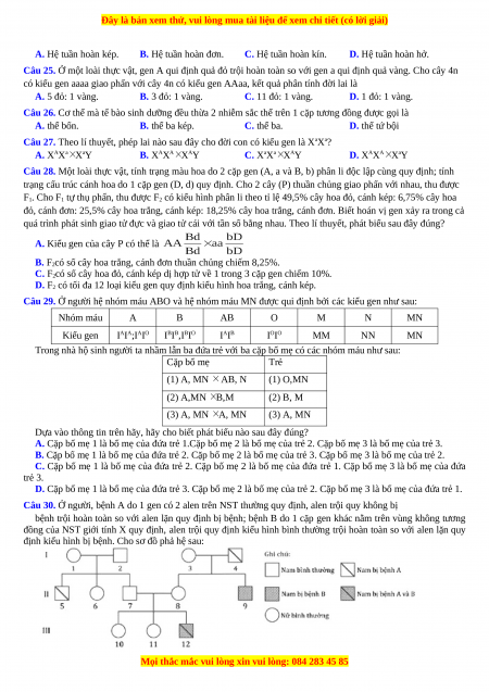 Câu 27. Theo lí thuyết, phép lai nào sau đây cho đời con có kiểu gen là XaXa? A. XAXa XaY B. XAXA XAY C. XaXa XAY D. XAXA XaY