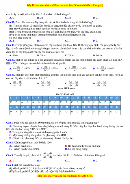 Câu 9. Một loài thực vật, alen A quy định thân cao trội hoàn toàn so với alen a quy định thân thấp, alen B quy
