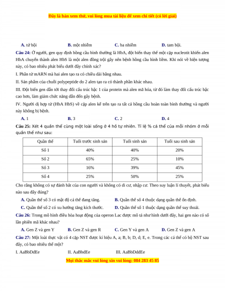 Câu 24: Ở người, gen quy định hồng cầu bình thường là HbA, đột biến thay thế một cặp nucleotit khiến alen