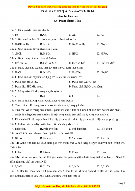Đề thi thử THPT Quốc Gia năm 2023 - Đề 14 Môn thi: Hóa học Gv: Phạm Thanh Tùng