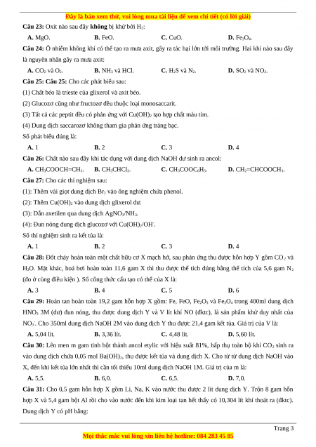 Câu 23: Oxit nào sau đây không bị khử bởi H2: A. MgO. B. FeO. C. CuO. D. Fe3O4.