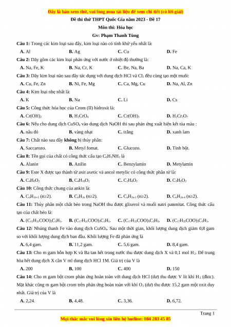 Đề thi thử THPT Quốc Gia năm 2023 - Đề 17 Môn thi: Hóa học Gv: Phạm Thanh Tùng