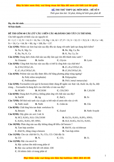 ĐỀ THI THỬ THPT QG MÔN HÓA – ĐỀ SỐ 9