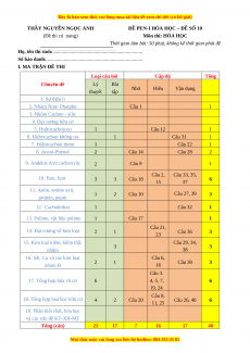 Số báo danh:............................................................................ I. MA TRẬN ĐỀ THI Loại câu hỏi Cấp độ Tổng Chuyên đề Lý Bài Nhớ Hiểu Vận dụng thuyết tập 1. Sự điện li 2. Nhóm Nitơ- Photpho Câu 1 1 3. Nhóm Cacbon - silic 4. Đại cương hữu cơ 5. Hiđrocacbon no 1 Câu 12 1 6. Hiđrocacbon không no 1 Câu 31 1 7. Hiđrocacbon thơm 1 Câu 22 1 8. Ancol-Phenol 2 Câu 14 Câu 28 2 9. Anđehit-Axit cacboxylic 2 Câu 9 1 Câu 2, Câu 33, 35, 10. Este, lipit 3 3 Câu 18 6 15 37 11. Amin, amino axit, 1 2 Câu 10 Câu 27, 39 3 protein, peptit 12. Cacbohidrat 1 Câu 32 1