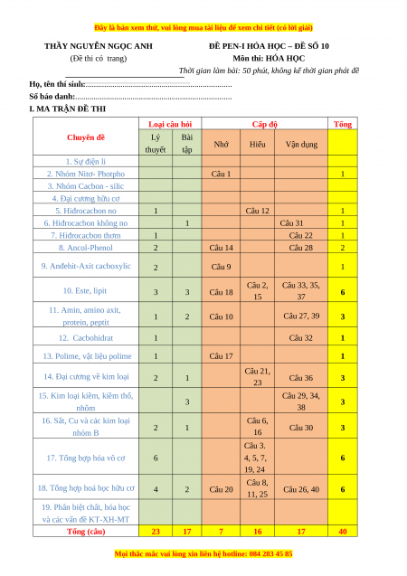 ĐỀ PEN-I HÓA HỌC – ĐỀ SỐ 10 (Đề thi có trang) Môn thi: HÓA HỌC