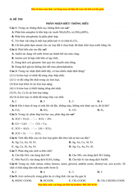 Câu 4: Khi ủ than tổ ong có một khí rất độc, không màu, không mùi được tạo ra, đó là khí? A. CO2. B. SO2. C. CO. D. H2.