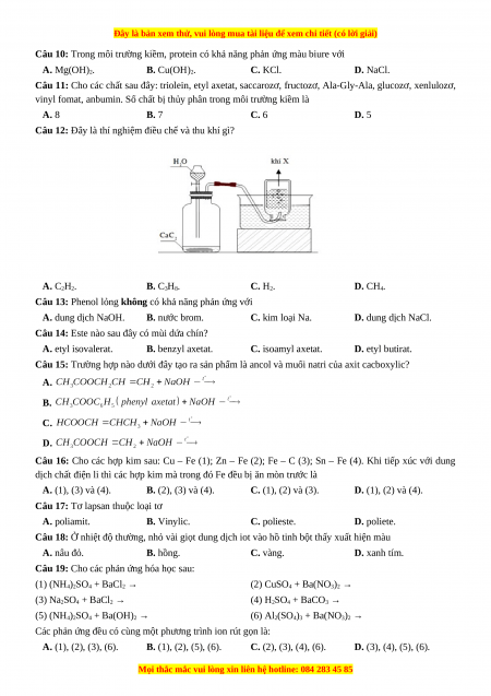 Câu 10: Trong môi trường kiềm, protein có khả năng phản ứng màu biure với A. Mg(OH)2. B. Cu(OH)2. C. KCl. D. NaCl.