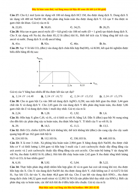 Câu 27: Cho 0,1 mol lysin tác dụng với 100 ml dung dịch HCl 1M, thu được dung dịch X. Dung dịch X