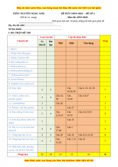 Cấp độ nhận thức Chuyên đề Lý Bài Tổng Nhớ Hiểu Vận dụng thuyết tập 1. điện li 2. Nhóm Nitơ-Photpho 3. Nhóm Cacbon-silic 4. Đại cương hữu cơ 5. Hiđrocacbon no 6. Hiđrocacbon không no 7. Hiđrocacbon thơm 8. Ancol-Phenol 9. Anđehit-Axit cacboxylic 10. Este, lipit Câu Câu 6, 33, 34, 36 2 5 7 18,20,28 11. Amin, amino axit , Câu 16, Câu Câu 3,9,37 3 4 7 protein, peptit 30 12,18 12. Cacbonhidrat 1 Câu 26 1