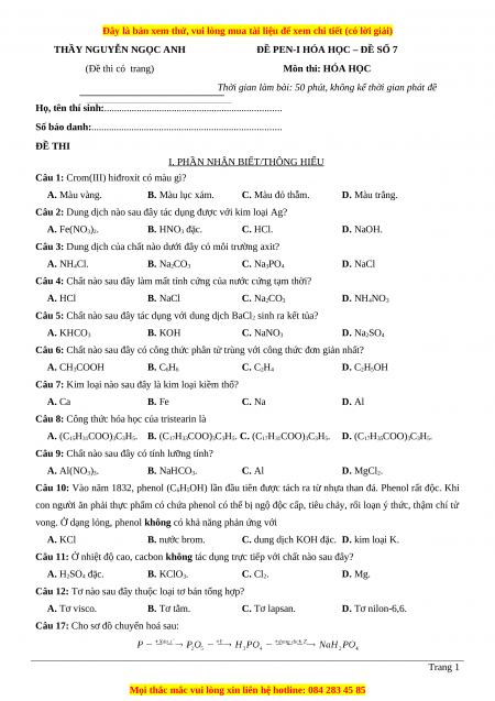 ĐỀ PEN-I HÓA HỌC – ĐỀ SỐ 7 (Đề thi có trang) Môn thi: HÓA HỌC