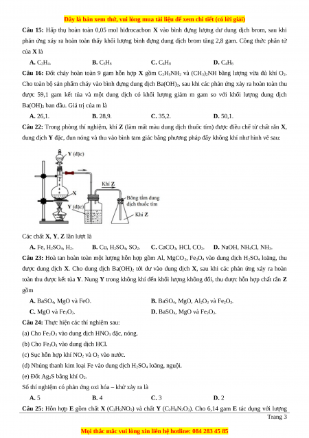 Câu 22: Trong phòng thí nghiệm, khí Z (làm mất màu dung dịch thuốc tím) được điều chế từ chất rắn X,